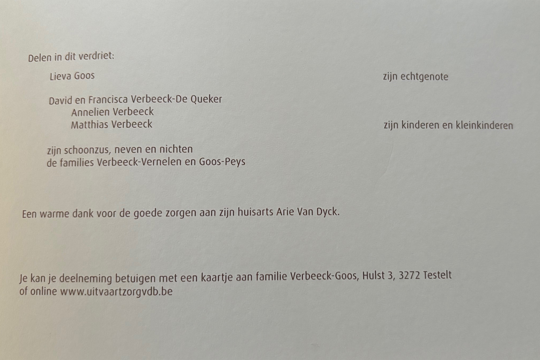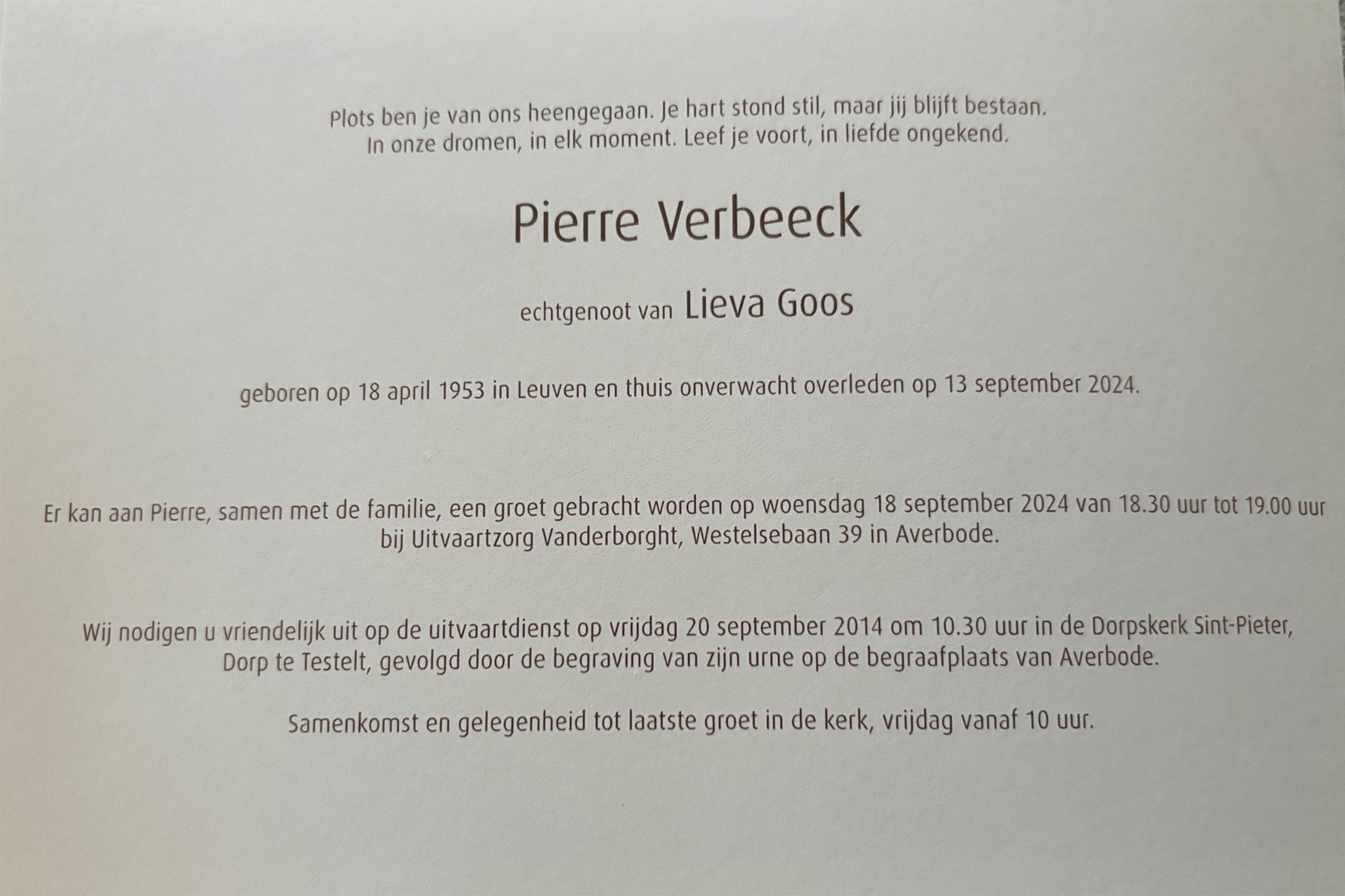 Met droefheid in ons hart melden wij het plotse heengaan van Pierre Verbeeck, echtgenoot van Lieva Goos. Lieva is al 20 jaar een trouwe vrijwilliger bij onze toneelgroep St.-Pieter Testelt.